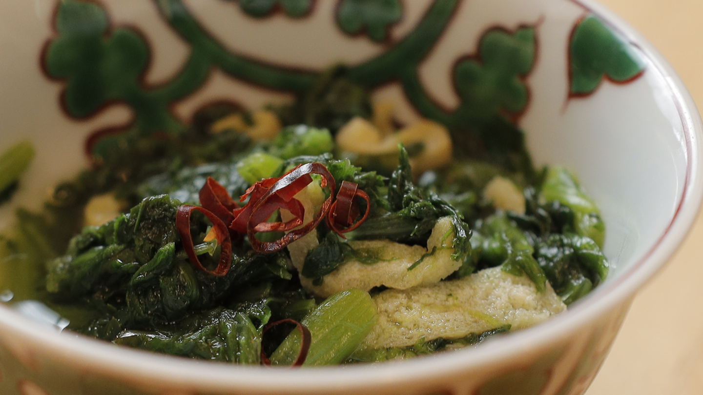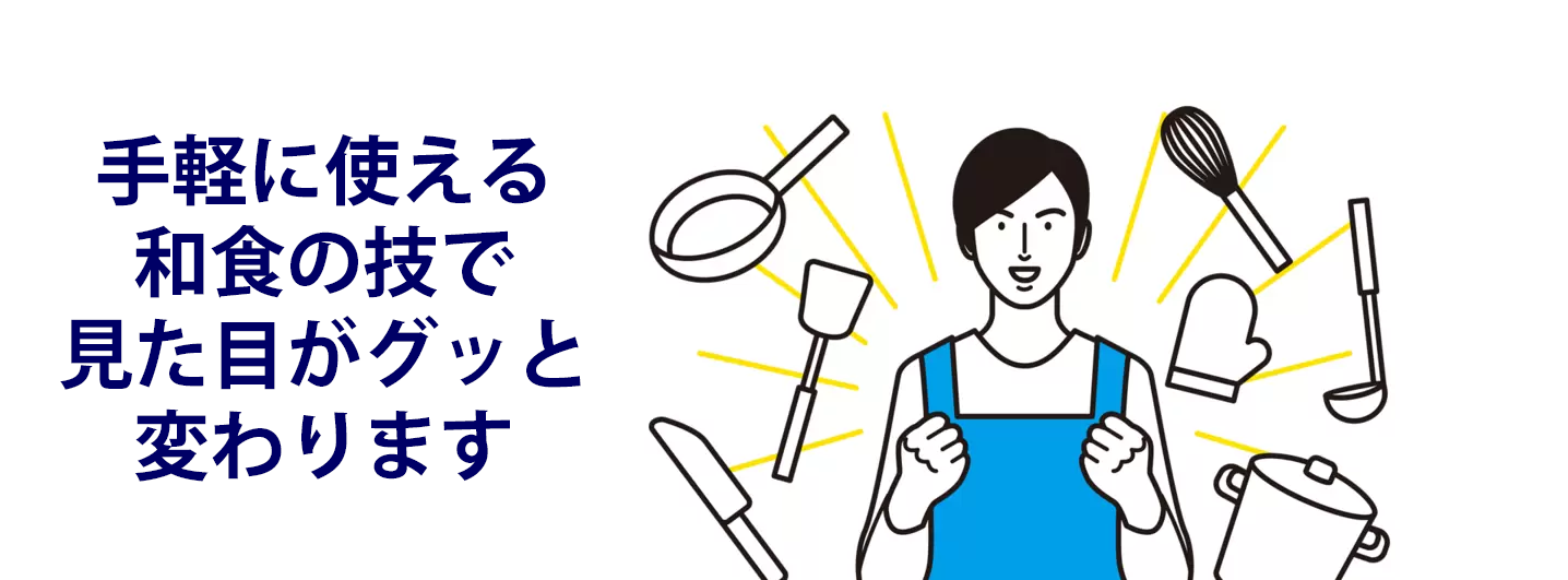 器に盛りつけたお料理の上に、かいわれ大根、刻んだねぎ、針しょうが、輪切りとうがらしなど、色鮮やかな食材をちょこんと乗せる。「天盛り」という、和食の盛りつけテクニックです。