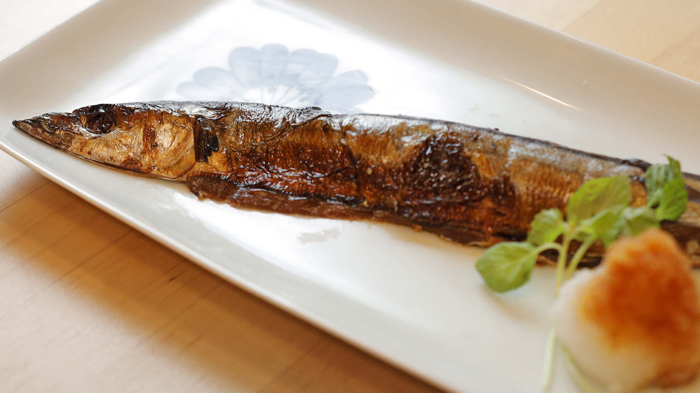 お魚をお皿に盛るときは、頭を左にして腹を内側にします。そして、器に対してナナメにお魚を載せます。こうするだけで、見た目がぜんぜん変わります。切り身の場合は、面積が広い方を左にして、同様に載せてみてください。